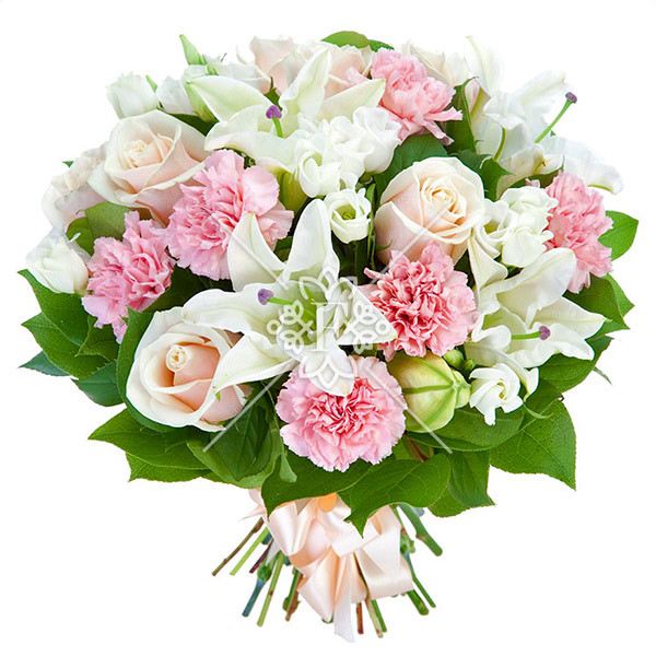 Белоснежные лилии с их утонченными лепестками сплетаются в единую композицию с нежно-розовыми королевскими розами и пышными гвоздиками, создавая гармоничное сочетание цвета и аромата.